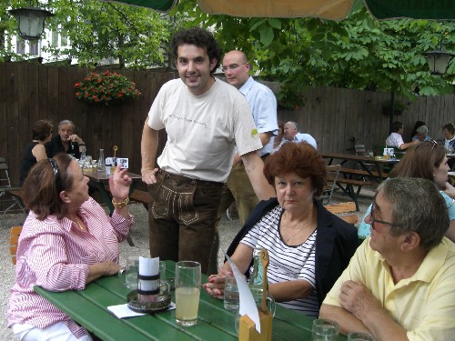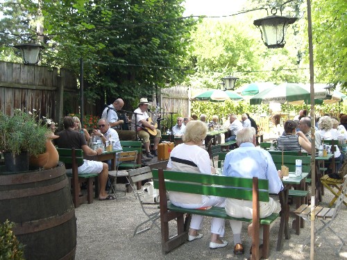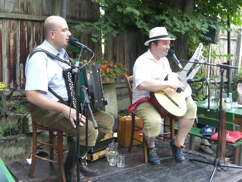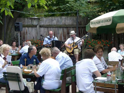 | Bei herrlichem Sommerwetter fand am Sonntag, den 27. Juli 2008 in unserem Heurigengarten ein Frühschoppen mit den 16er Buam statt. Mit ihren traditionellen Instrumenten, chromatische Schrammel- und diatonische Steirische Harmonika, Kontragitarre und Holzlöffel(!), spielten sie alte Wienerlieder aber auch neue, moderne Kompositionen aus der eigenen Feder - zahlreiche Besucher und ausgelassene Stimmung, die bis in den späten Abend anhielt, machten deutlich - Das Wienerlied lebt! Zu den Fotos... |